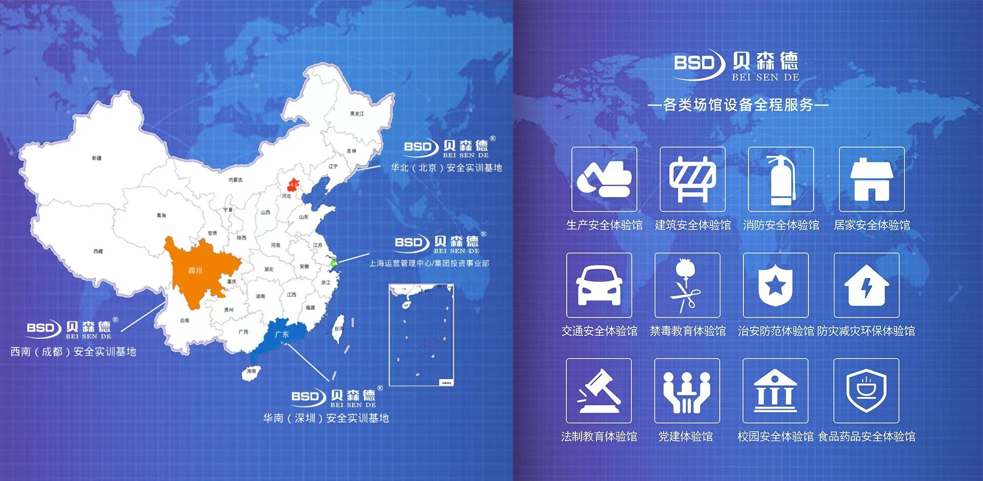 貝森德旗下有:貝森德、貝創(chuàng)科技、瓦令科技等品牌,主營業(yè)務(wù)由:體驗(yàn)式教育服務(wù)、綠色環(huán)保服務(wù)等構(gòu)成。 提供各類場館設(shè)備全程服務(wù):消防體驗(yàn)館、消防安全體驗(yàn)館、生產(chǎn)安全體驗(yàn)館、建筑安全體驗(yàn)館、居家安全體驗(yàn)館、交通安全體驗(yàn)館、工地安全體驗(yàn)館、VR安全體驗(yàn)館、校園安全體驗(yàn)館、食品藥品安全體驗(yàn)館、安全教育體驗(yàn)館、禁毒體驗(yàn)館、禁毒教育體驗(yàn)館、治安防范體驗(yàn)館、防災(zāi)減災(zāi)體驗(yàn)館、法制教育體驗(yàn)館、黨建體驗(yàn)館、模擬滅火體驗(yàn)、安全體驗(yàn)教室等。業(yè)務(wù)覆蓋全國,主要覆蓋上海、北京、深圳、四川成都、浙江、江蘇、云南等地。